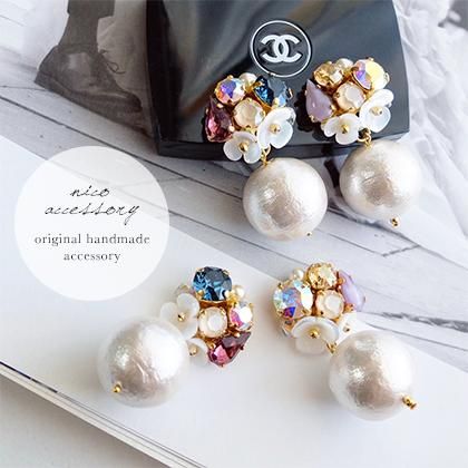 【素材】金具部分:合金、スワロフスキー、スワロフスキーパール、ヴィンテージストーン、コットンパール、シェル
