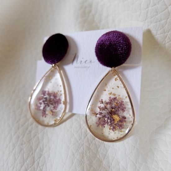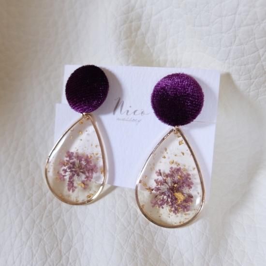 【素材】イヤリング金具:真鍮+シリコンゴム、ピアス金具:ステンレス、コーデュロイ、ドライフラワー、樹脂