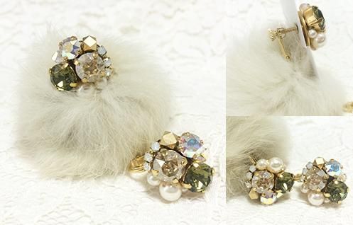 スワロの輝きと耳元でゆらゆら揺れるファーの組合せが愛らしいイヤリングです。