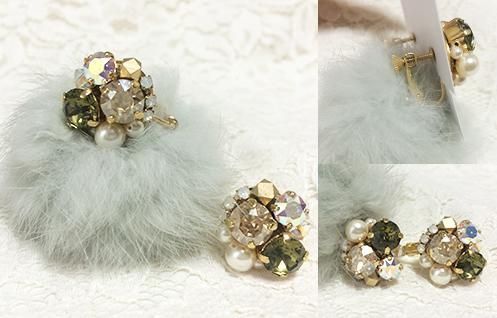 スワロの輝きと耳元でゆらゆら揺れるファーの組合せが愛らしいイヤリングです。